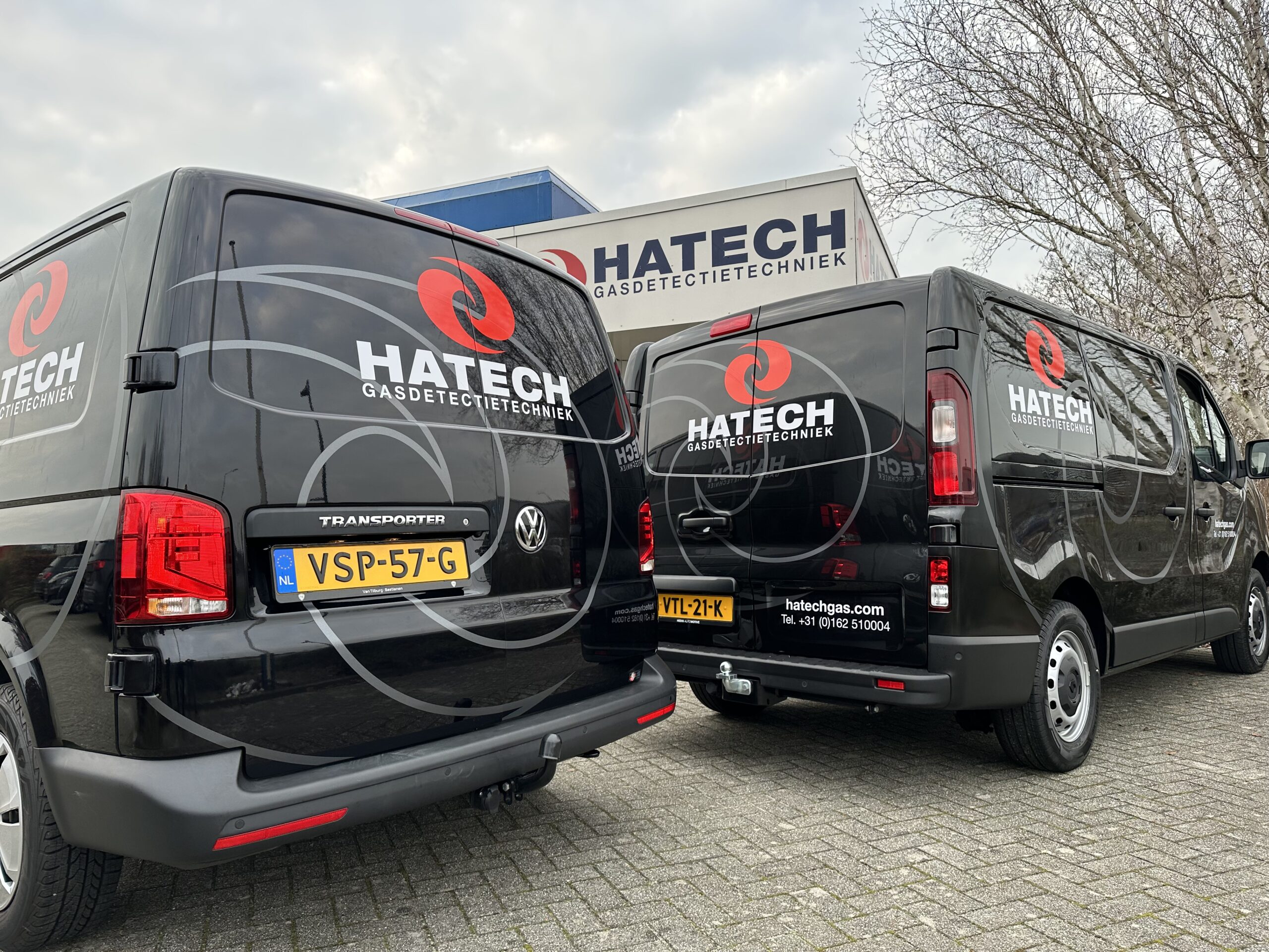Uiteraard hebben we weer gekozen voor de uitvoering in de Hatech huisstijlkleuren en zijn de logo’s van Hatech wederom op de twee nieuwe bussen te vinden. Er is gekozen voor een subtiele nette belettering met donkergrijze watermerken op de zwarte bussen, wat zorgt voor een zeer nette en mooie professionele uitstraling.